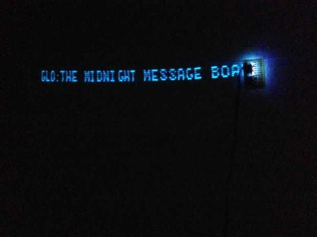El resultado es un fresco pizarrón místico, que resplandece en la oscuridad y muestra las tendencias de Twitter, Feeds RSS y texto personalizado en mi pared... descoloramiento lentamente hacia fuera.
