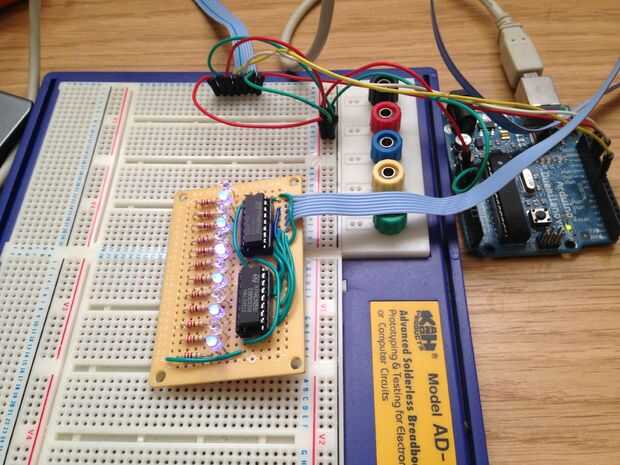 Conecte su arsenal del LED para el Arduino usando un protoboard y unos cables, luego descargar el bosquejo y lo subo a Arduino, si ha soldado y conectado todo correctamente y el bosquejo debe girar a ON cada LED uno por uno.