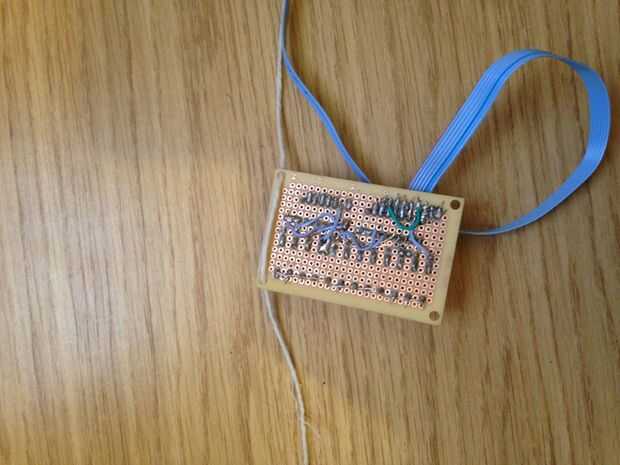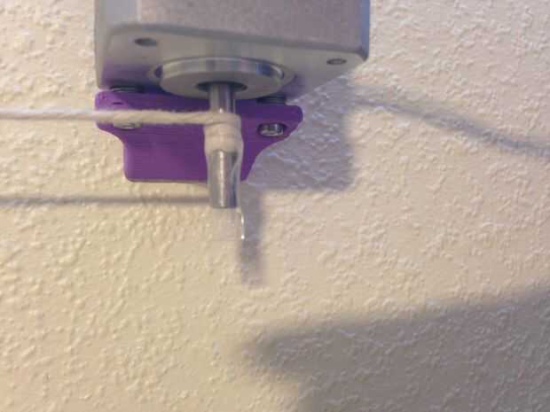 A continuación, tomar un extremo de la cadena de la parcela y enróllelo alrededor el eje del motor un par de veces y cinta adhesiva para que no resbale, guiar el la cadena a través del gancho sobre el motor, luego colócala en los orificios de la perfboard.