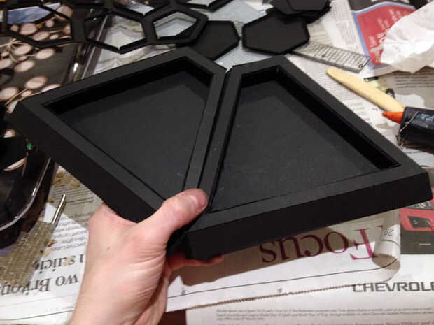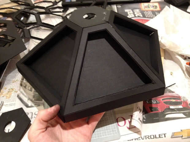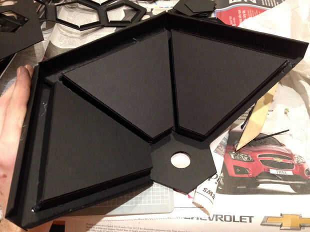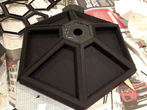 Pegado a cada una de las seis secciones de base? Espléndida. Ahora pega las aletas en el borde de cada panel en el borde de otra, hasta que esté montados en un anillo. Pegue uno de los hexágonos perforados en el centro para mantenerlos todos juntos. Esto es donde se sentará el árbol.