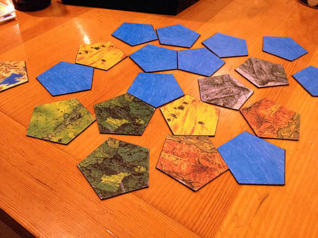 Usted puede haber notado que usted tiene once ranuras de baldosas pentagonales (el Polo Sur es automáticamente un desierto). Usted puede haber notado también que regular Catan azulejos son hexagonales. Usted necesitará hacer algunos sustituyen los azulejos. Voy a dejar hasta encontrar una manera de hacer esto. Sugerencia: un escáner/cámara digital, papel adhesivo de la impresora y un montón de tarjetas podrían ser mano.