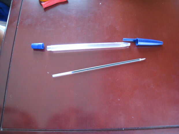esto es un arma muy simple con un rango de aproximadamente 10 pies. Se parece a una pluma y puede incluso escribir como un lápiz. Dispara cualquier tipo de objetos pequeños.Paso 1: desmontar Desarmar la pluma. Debe tener una tapa, un cuerpo, un resor
