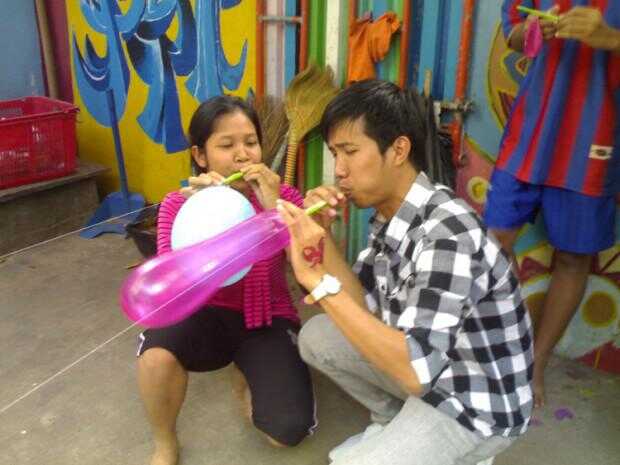 2. con cinta adhesiva, fije una mitad de la paja en condiciones de pasar a través del cuello del globo - reventando el balón a través de la paja para poner a prueba su sello