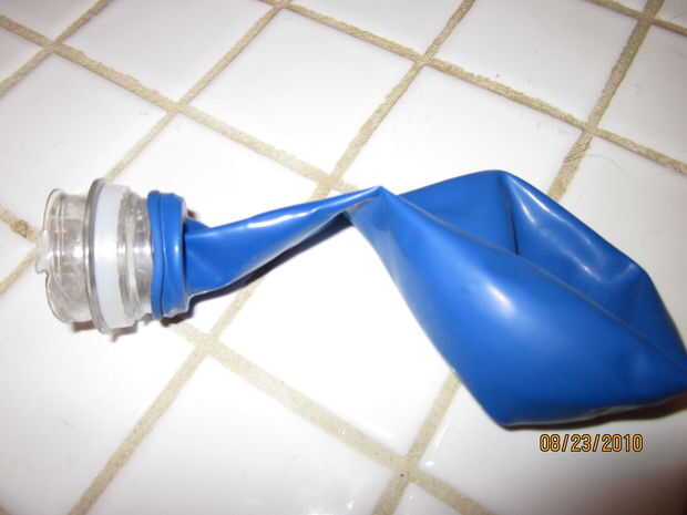 Corte la parte superior de la botella de agua de (ver pic), a continuación, estirar el globo sobre ella.