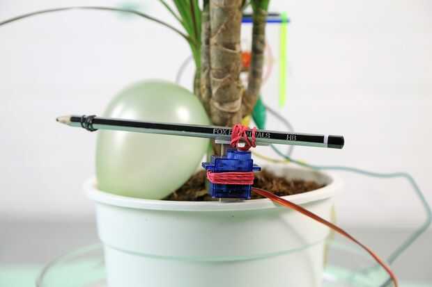 Puede que necesite experimentar con posiciones y ángulos de los servomotores y el globo. Si utiliza agua, lugar de Arduino en la pequeña bolsa de plástico para evitar salpicaduras, también puede colocar la planta en una bandeja o en una toalla vieja. Las cosas están a punto de causar problemas.