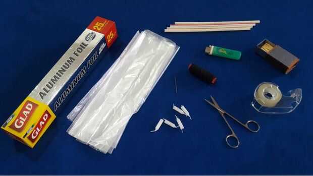 construir una vela con globo aerostático utilizando plástico, madera de balsa y velas de cumpleaños del pintor.Paso 1: Cortar el plástico y los bordes de sellado.Diseño de sus materiales en una cartulina grande.Tire aproximadamente 6 pies de plástico