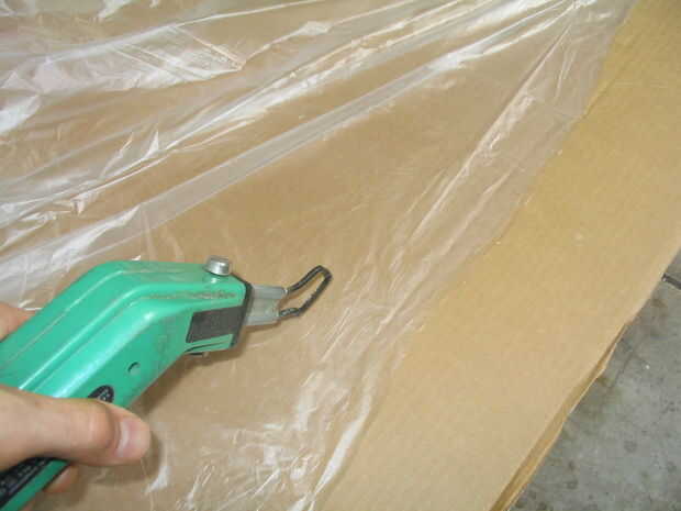 Doblar la hoja por la mitad a lo largo del lado de 9 pies formando una doble hoja de 4.5 x 6 pies uso un cuchillo caliente para sellar los bordes de dos 4.5 pies. Un cuchillo caliente eléctrico hace realmente fácil, pero también se puede hacer con un viejo cuchillo de metal calentado a la llama.