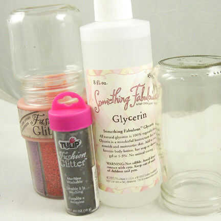 Una vez que el pegamento esté seco es hora de llenar sus cúpulas de nieve. Llenar el vaso casi completamente lleno con agua destilada, añadir un poco poco de glicerina (que mina encontré en el pasillo de jabón de Hobby Lobby) y una pizca de Tulip moda brillo.