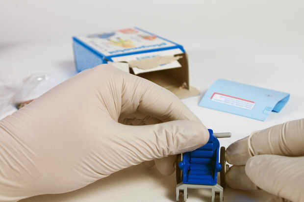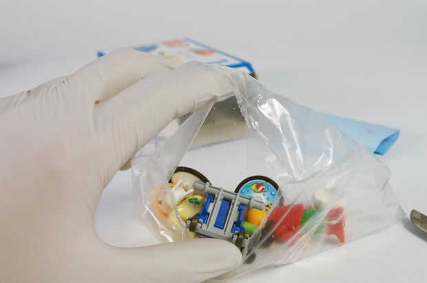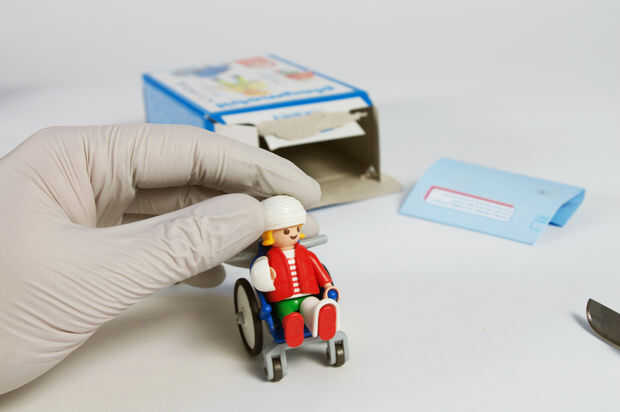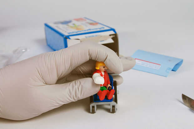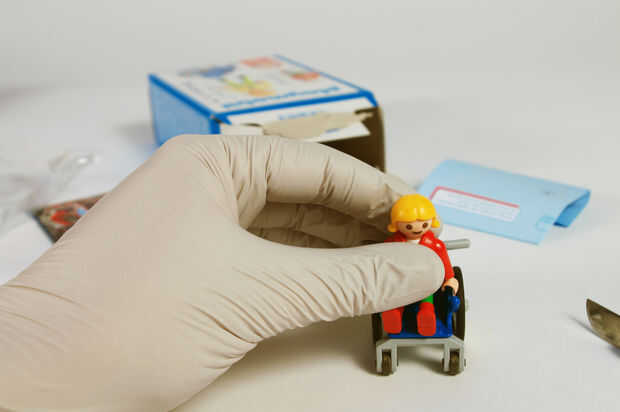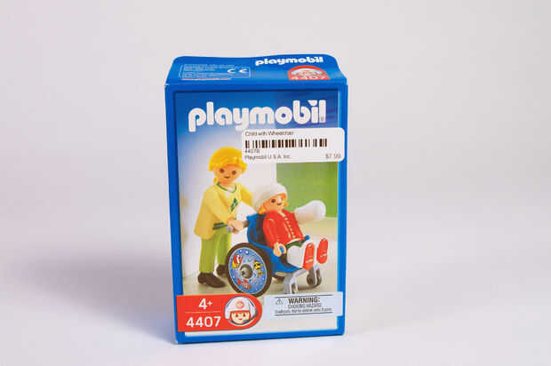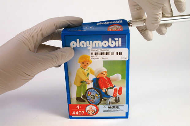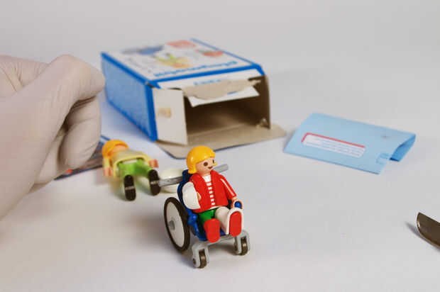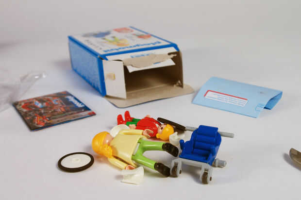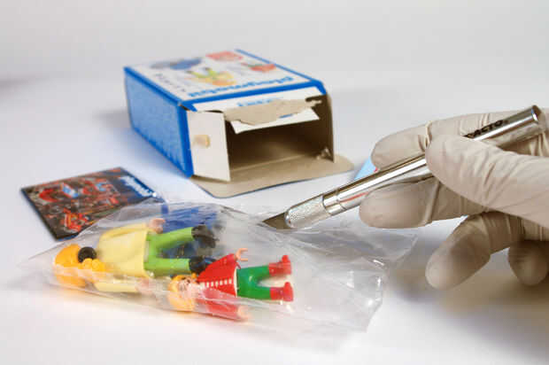Usar su bisturí para abrir cuidadosamente el envase para el Playmobil Child con kit de silla de ruedas.
