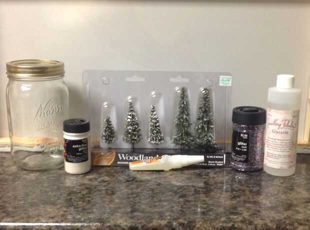 Los materiales que se necesitan para este proyecto incluyen un tarro de masón, pegamento, purpurina, mini árboles de Navidad, agua y glicerina.