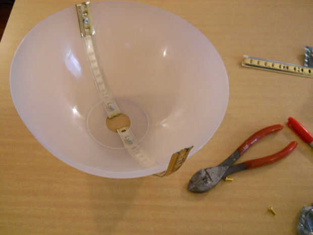 Con el tornillo para base en el lugar, doblar el soporte para el contorno de la sombra. Con su taladro, perforar un segundo agujero a través de la cortina, inserte un tornillo de máquina en el borde superior de la cortina y luego dobla el extremo del soporte sobre el borde superior y apriete firmemente con alicates.