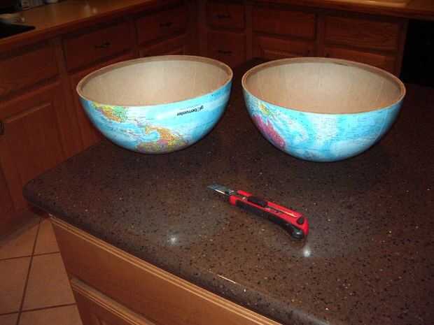La parte más difícil de este proyecto fue cortar el globo por la mitad.  Globos se forman a partir de cartón, y cartulina tiende a conseguir bastante desiguales si tratas de verla.  He encontrado que el mejor método es mantener puntuación del globo en el Ecuador con un cuchillo de la tienda hasta que finalmente la corte en dos.  Desafortunadamente, la mayoría globos tienen un pedazo de cartón algo grueso pegado en esta área, por lo que el viento hasta tener que cortar la cartulina que es casi un espesor de media pulgada.  Si usted trabaja en él, sin embargo, usted eventualmente cortará a través de él, y si mantener puntuación alrededor en la misma línea, usted encontrará que el corte es muy suave.