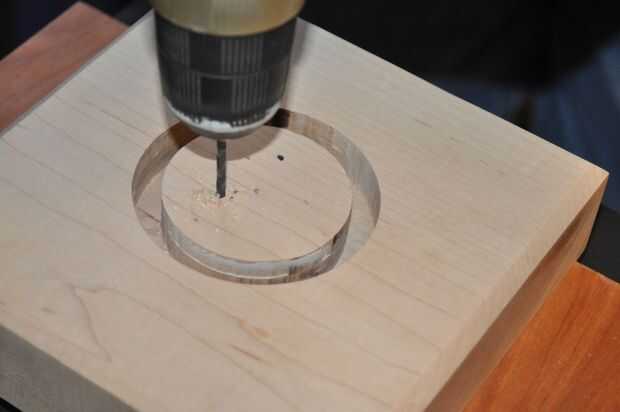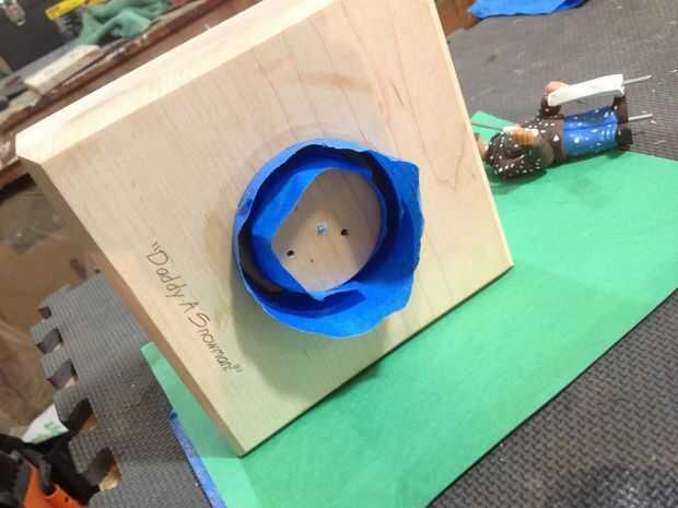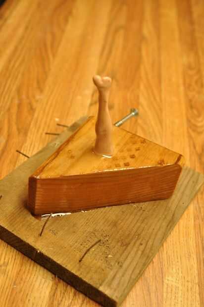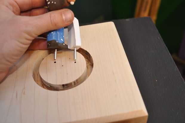 Perforé hasta el agujero para la clavija del router (centro exacto de la pieza) para crear un agujero en la parte inferior que pude poner un tornillo en. Esto me dio una manija - una forma de sostener el bloque de madera sin tocar cualquiera de la superficie mojada con. También perforé los dos agujeros que montaría los cables de la figura a. Los agujeros eran lo suficientemente pequeños como para que la figura podría ser empujada en la base con los cables en los agujeros y no se preocupe de la figura caiga cuando se volcó.