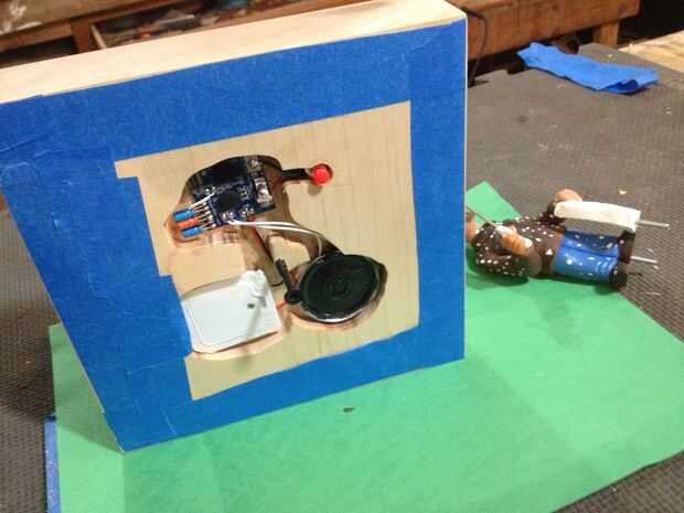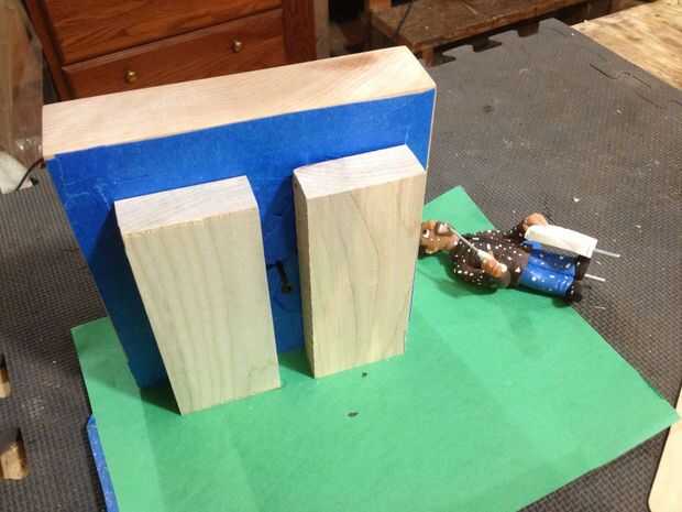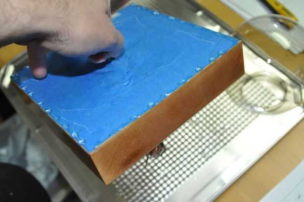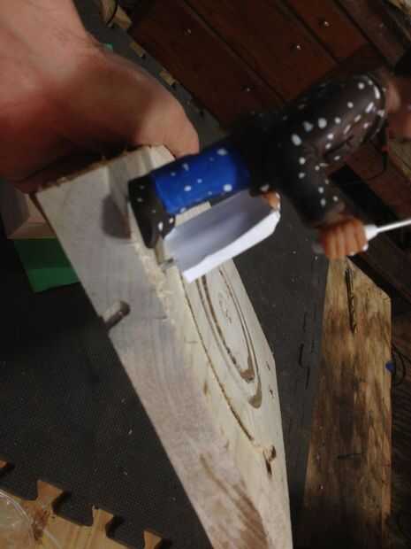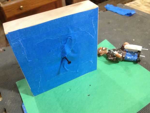Después de la capa en solo la ranura fue hecha y deja para la cura de un día, solía cinta de pintor azul enmascare la compete parte inferior de la madera y base de ambos bordes de la ranura. La cinta sería mantener la capa de la figura y el resto de la base de la ranura de relleno. La cinta en la parte inferior de la base sería que sólo pudiera despegarse de cualquier gota que se acumula en el borde inferior.