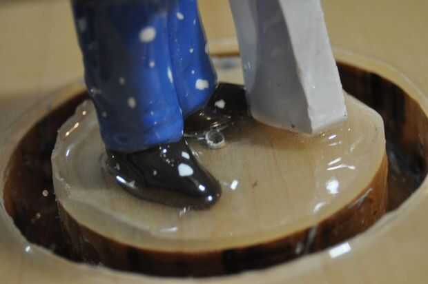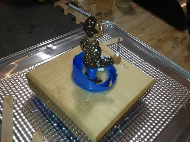 El epoxi es grueso, pero también funciona, así que poco a poco girando la figura y se vuelque tanto derecho-lado-para arriba y para arriba-lado-abajo, era capaz de conseguir una capa uniforme sobre la figura. La capa era extra gruesa de los pies del personaje y exudado en la base, actúa como una carpeta gruesa y permanente entre la figura y la base.