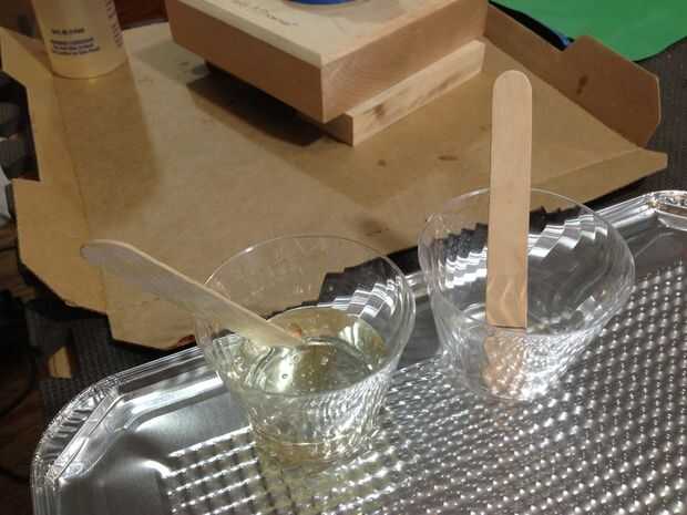Sin embargo, no sé cuán bien funcionaría el sellador con la arcilla del polímero, o cómo funcionaría entre la arcilla y la madera. Así, al igual lo practicado en la madera de desecho, también hice una muestra de un lote muy pequeño de esmalte Super en un viejo pedazo de una escultura de arcilla y algunos restos de madera.