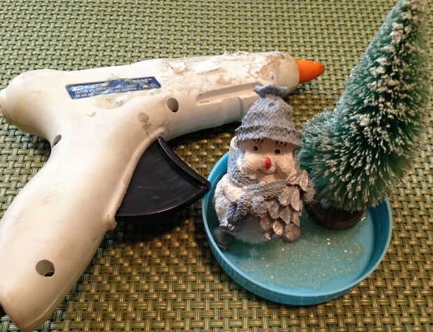 Utilice pegamento caliente para fijar las miniaturas de la Navidad en el interior de la tapa de la jarra.  Asegúrese que nada interfiera con las ranuras o no se cierra completamente.  Pegué el brillo en la parte inferior.