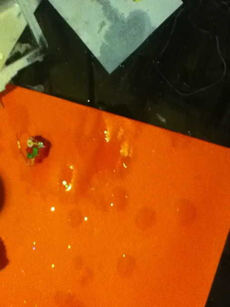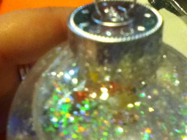 Puesto de nuevo en el adorno de la parte superior y sellar con pegamento caliente.  Compruebe que el tuyo tenga agujeros en la parte superior por el gancho como mne.  Esto necesita también el pegamento caliente.  La última foto es lo que sucede cuando no se sella bien.