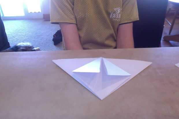 Doblar las dos puntas en el frente del papel a la parte superior del triángulo.