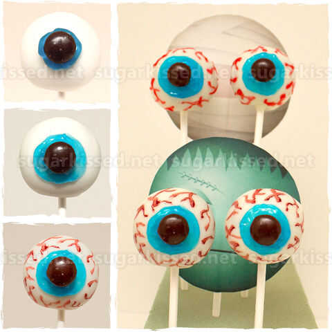 Cuando se haya secado el chocolate, M & Ms se asegurará al frente de sus cake pops. A continuación, aplique algunos azul (o verde) decoración de gel en un círculo alrededor de cada M & M. uso una brocha pequeña y limpia para esparcir el gel hacia fuera en un círculo ordenado para crear el iris de cada pop de pastel del globo ocular. A continuación, utilizar otra pintura limpia cepillo y rojo gel colorante para pintar en las venas de cada globo ocular (opcional). Una última vez, pare los cake pops en la espuma de poliestireno bloque o torta pop stand para secar. Dejo que seque durante la noche antes de embalarlos de la mina. El gel de decoración nunca se seca duro pero el M & M evitará que cualquier envoltura de plástico el sahumerio lo.