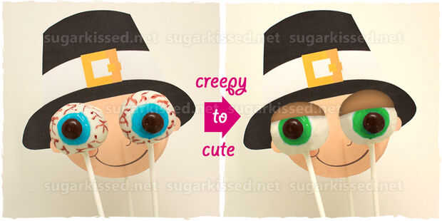 Para activar los globos oculares en pops de tarta de acción de gracias que son más lindos que derrite creepy, que sugiero dejar fuera las venas de color rojo, añadir un párpado sumergiendo cada uno en el caramelo de mantequilla de maní, basándose en las pestañas con comida para colorear marcadores (para peregrinos femeninos) y cambiar los colores de los ojos.