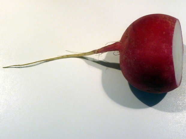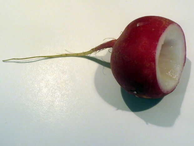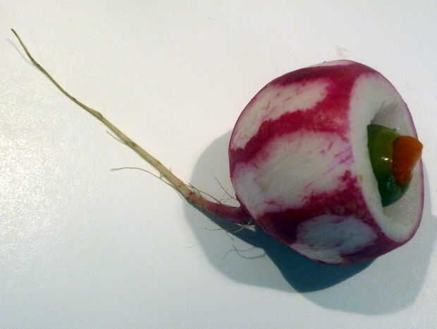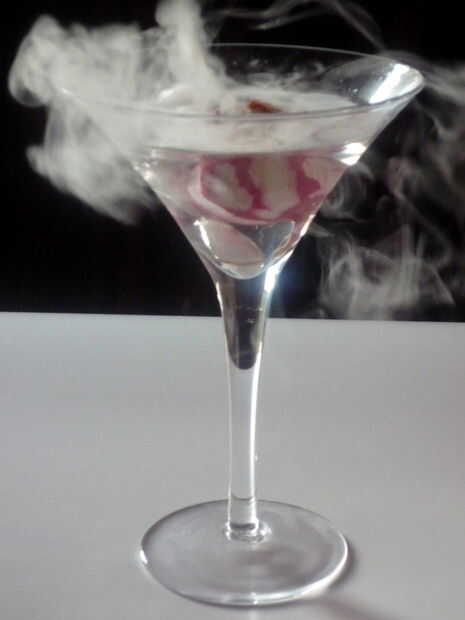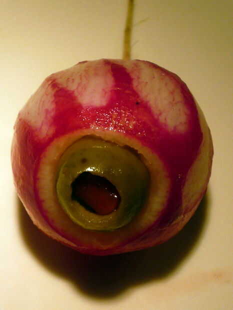 Lave un rábano, teniendo cuidado de conservar la raíz (el "nervio óptico" del globo ocular). Recortar la corona con el fin de dejar un área expuesta de la blanco del mismo diámetro que su aceituna. Usando un pequeño cuchillo, tallar hacia fuera un agujero del tamaño de una aceituna. Pelar parcialmente el rábano, va para un aspecto venoso y capilar roto. Pop una oliva en el agujero, pimiento relleno asomando hacia fuera y usar el rábano para adornar un martini (gin: vermouth de 6:1). Si usted no tiene ningún hielo seco, agitar los ingredientes con hielo en una mezcladora de cóctel y añadir a un glasss de martini bien frío. Si tienes hielo seco, simplemente pop un trozo en la bebida y el servicio (atención al destinatario no a beber hasta que la bebida ha dejado de fumar).