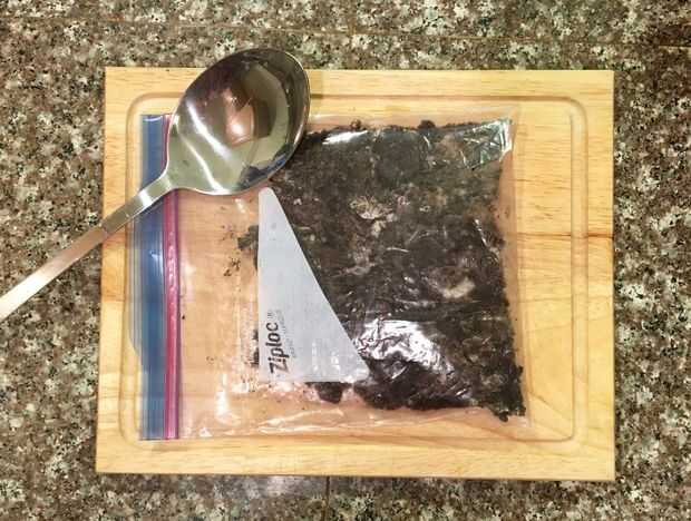 Hay algo extra delicioso sobre una galleta con trozos extras unos cuantos y este es el paso donde que la magia sucede. Tirar unas Oreos (10-26) a un lado. Estos serán tus ojos más adelante. Tomar el resto de las mini oreos y aplastarlas. Lo hice por colocarlos en una bolsa ziplock y balanceo de la parte posterior de una cuchara de metal sobre las galletas.