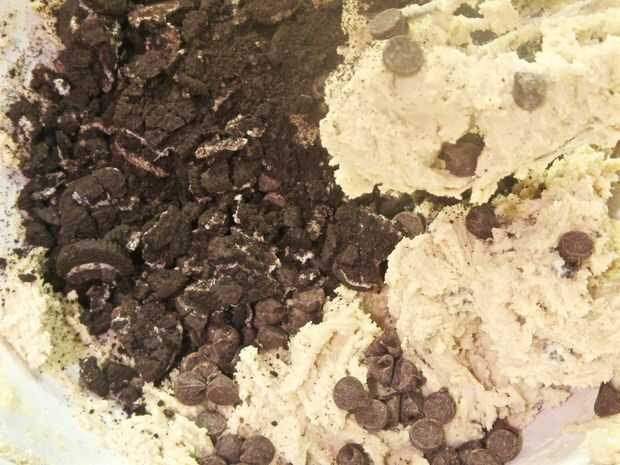 Añadir 1 taza de galletas Oreo machacada y 1 taza de chispas de chocolate a la masa para galletas. Doblar uniformemente en la masa.