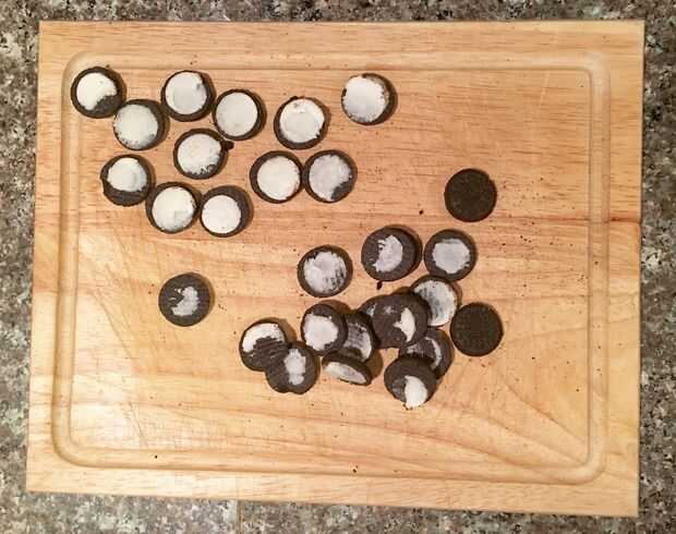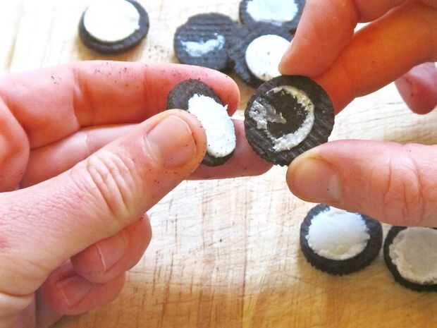 Mientras que las cookies están enfriando, empezar separando tus oreos. Es ese mismo método clásico de yoru días de infancia. Agarrando la cookie a ambos lados de la oreo con las dos manos, girar las manos en opuestas direcciones, torciendo las galletas separadas. Mantenga el lado que tiene la mayoría de la crema. Estos son los globos oculares.