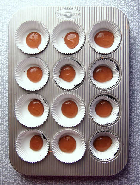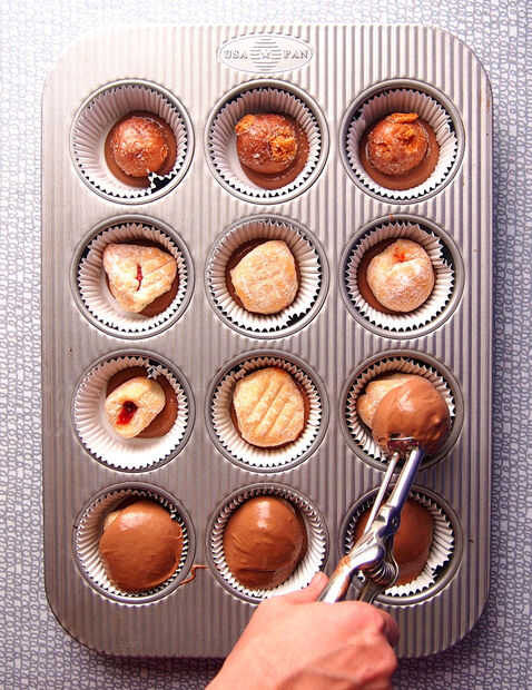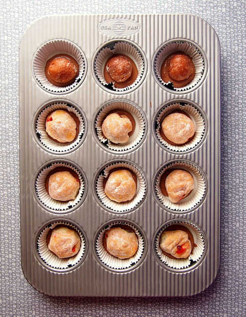 Añadir aproximadamente 1/2 cucharada (cuchara #100) de mezcla para pastel en la parte inferior de cada envoltura de la Magdalena y luego añadir un agujero de la Dona de jalea.