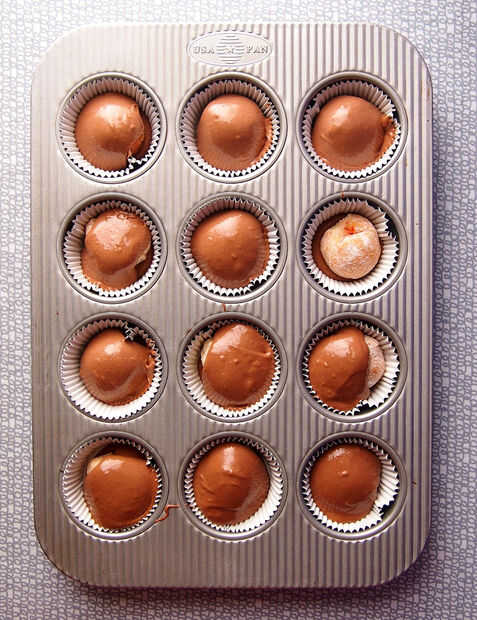 Ponga 1,5 cucharadas mezcla para pastel (#40 scoop) sobre la parte superior cada buñuelo (también experimenté con agujeros de Donut 3 calabazas - en la fila superior de los cuadros).