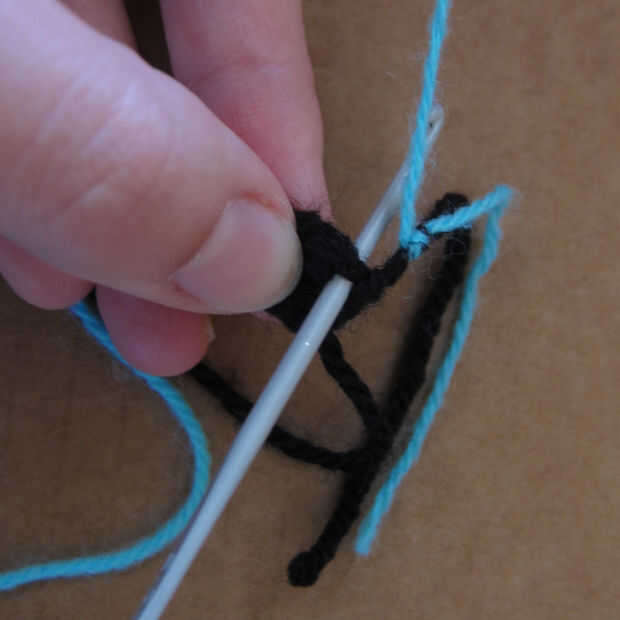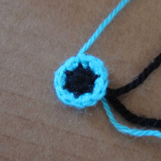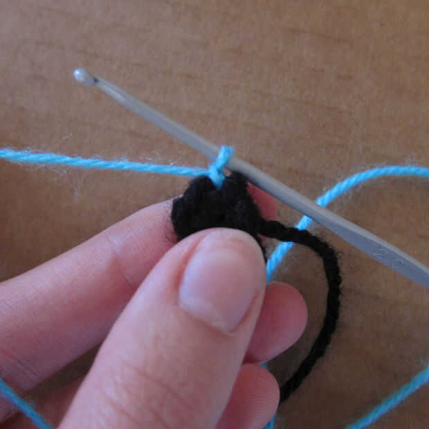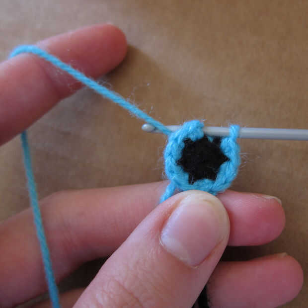 Ronda 2: Inserte el gancho en la última puntada. Tire un lazo del hilo azul, hilado encima y tire a través.