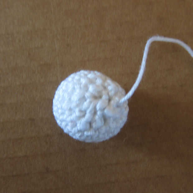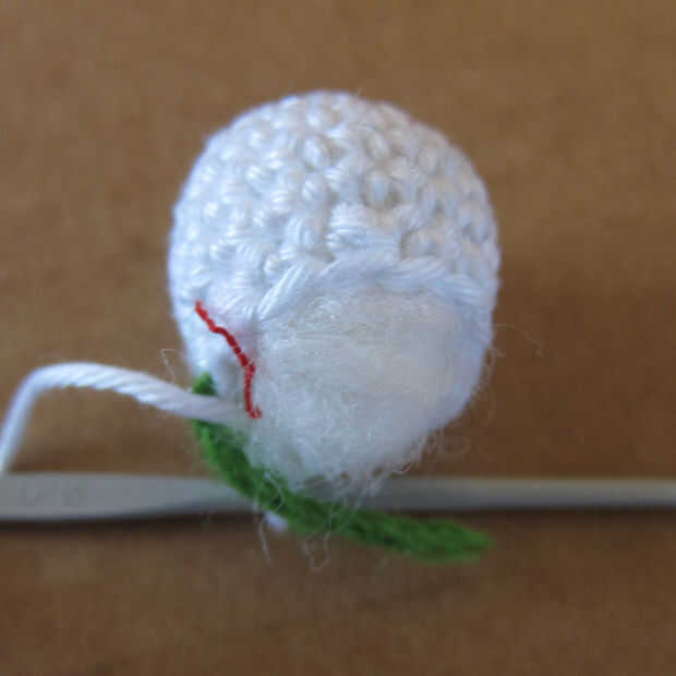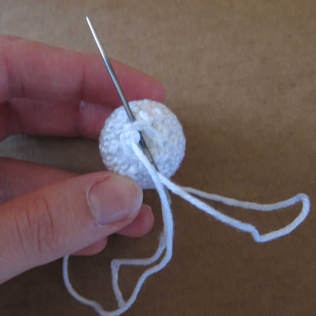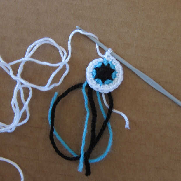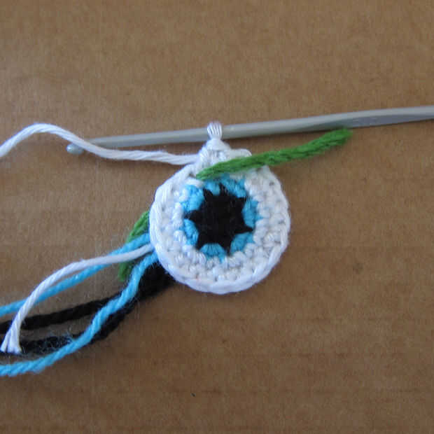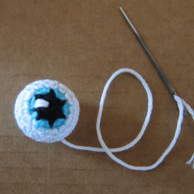 SL st en la siguiente puntada, luego cortar el hilo dejando una cola larga. Tire del hilo a través del último lazo. Utilice la aguja para tejer el hilado a través de la última ronda y tirar para cerrarla. Atar el hilo y páselo a través del centro de la pupila. Bordar el brillo blanco, atar el hilo, tire de ella a través del globo ocular y cortarlo.