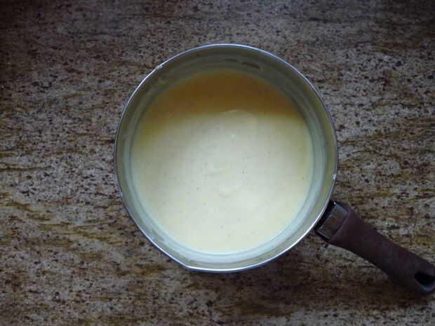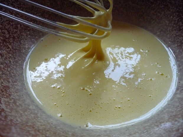 - Una vez que acaba de salir la leche a hervir, retirarla del calor y añadir 1/4 de la leche caliente a la mezcla de huevo y batir al mismo tiempo. Este método se llama revenido y esto evitará que las yemas de cuajar. Mezclar bien y añadir el resto de la leche.