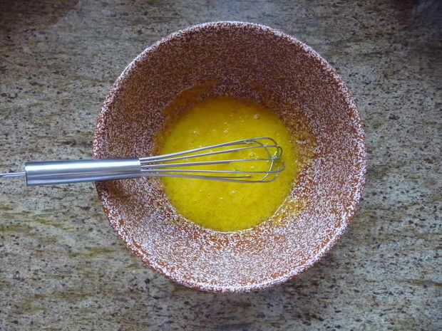 - Mientras tanto, batir las yemas y el azúcar hasta que va de amarillo brillante a de color pálido amarillo y espeso. Batir en la fécula de maíz.