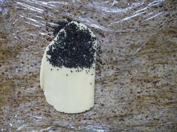 - Coloca la bola de masa entre dos hojas de film transparente y estirar finamente, 1/10 de pulgada. Presione las semillas de sésamo sobre la masa enrollada hacia fuera.