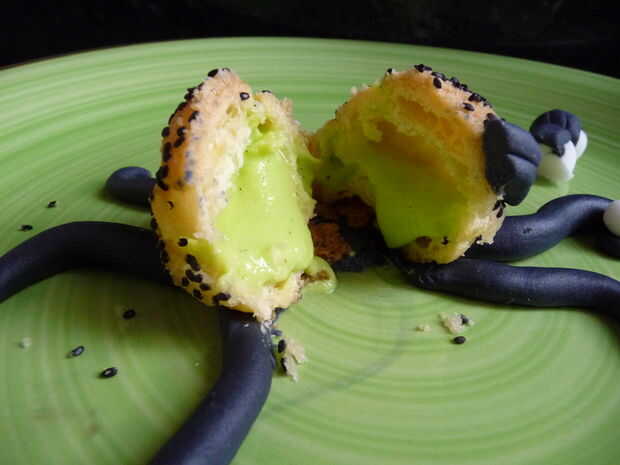 2. Usando agua como pegamento: colocar juntos todos los tentáculos, colocar el hojaldre de crema en la parte superior, fijar los tres ojos arriba. Coloque un pequeño globo ocular en cada tentáculo.