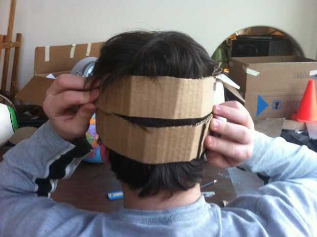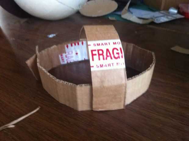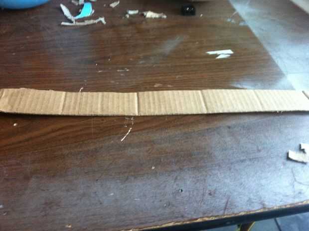 Primero, corte una tira muy larga de cartón, ya mejor. Si usted quiere ser matemático sobre ella, medida de que la cabeza entonces asegúrese de que usted corte la tira por lo menos cuatro pulgadas más largo que el. Envolver el cartón alrededor de su cabeza como se ve en la segunda foto, entonces Marque a ambos lados de la cartulina con un lápiz. Tomar la tira, cortar a la mitad de la cartulina en los puntos de medida en los lados opuestos, un corte en la parte superior de un lado de la tira, el otro en la parte inferior del lado opuesto de la tira. Ahora debe capaz de encajar las dos tiras como se muestra en la tercera imagen. Cortar las aletas de la parte posterior de la cartulina, dejando sólo una media pulgada, luego pegar el resto de la tira como se muestra en la foto 4.
