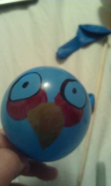 Dibujé las caras en el inicio con el pico. Yo mi hijas enojado aves vendajes recipiente para usado como una guía aproximada. El pájaro azul parece tener un pico simple triángulo y ojos tristes. No tomo fotografías detalladas de dibujar las caras pero creo que puedo explicarlo además incluiré una foto de la cara dibujada antes de colorante en. Esta es una foto del globo grande pero la cara no es diferente de los globos más pequeños.