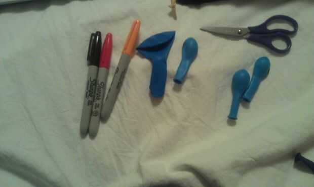 Dibujar el pico triangular en primer lugar, con su marcador naranja, esto era más fácil para mí. A continuación dibujar dos ojos redondos, dejando espacio entre ellas, usar negro. A continuación dibuja una línea que se ligeramente curvada desde la parte inferior de los ojos al pico en tanto exterior como interior, con rojo. (Ver cuadro de explicación sobre esto, no estoy seguro de cómo poner en palabras) Ahora el color en el pico de la naranja y el rojo 'bolsas' debajo de los ojos. Una vez se es de color en dejarlo seco un poco antes de desinflarse. (Un globo de colores escama de color cuando están desinflados).