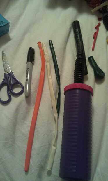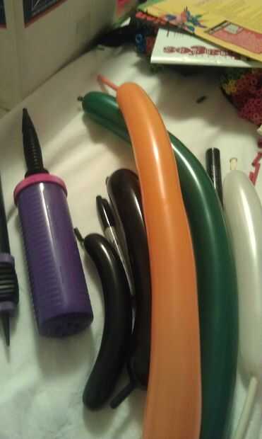 Usted necesitará una bomba de mano, 4 260 de un negro, naranja, blanco (solo un trozo la mitad basta) y verde oscuro. Realmente utilicé dos globos de desecho negro uno a 160 la otra un 260 pero era sobre el equivalente de uno. Podría utilizar un 260 para ambas partes del negro. Y por supuesto un rotulador negro y tijeras.