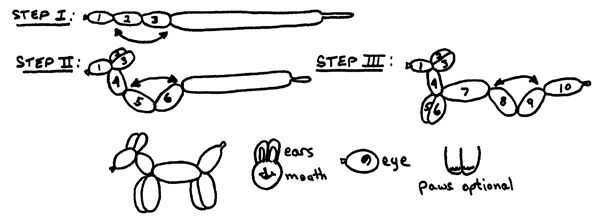 Tuerza una burbuja larga (unos 7") para el cuerpo (7) y dos más burbujas de las patas traseras (8 y 9) (misma longitud que las patas delanteras), gire las patas en el cuerpo, dejando una cola (10). Decorar los ojos y la boca y la nariz con un rotulador o con otro marcador de poco alcohol.