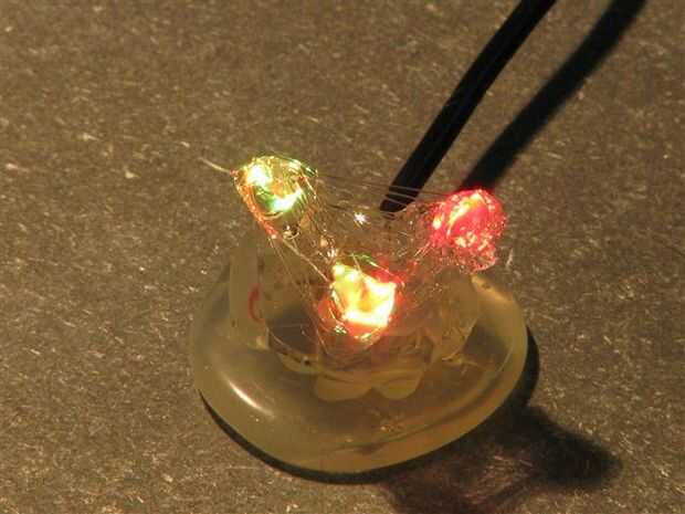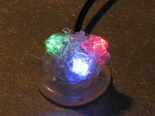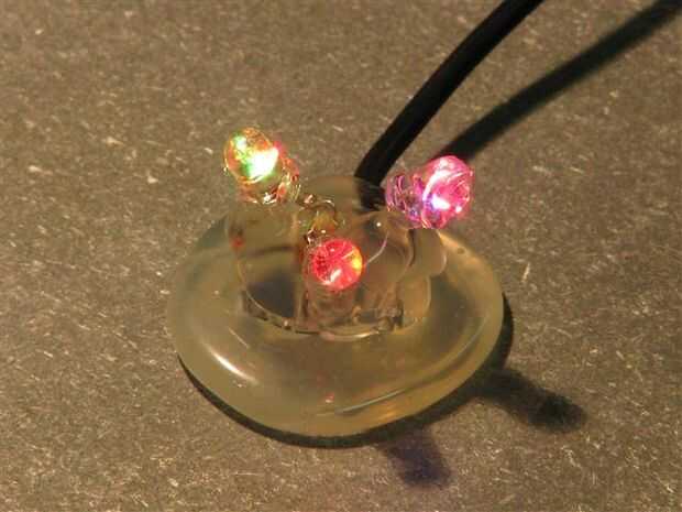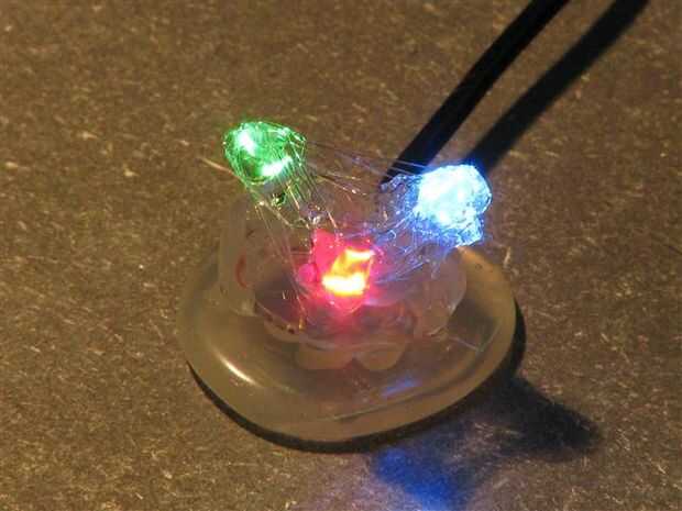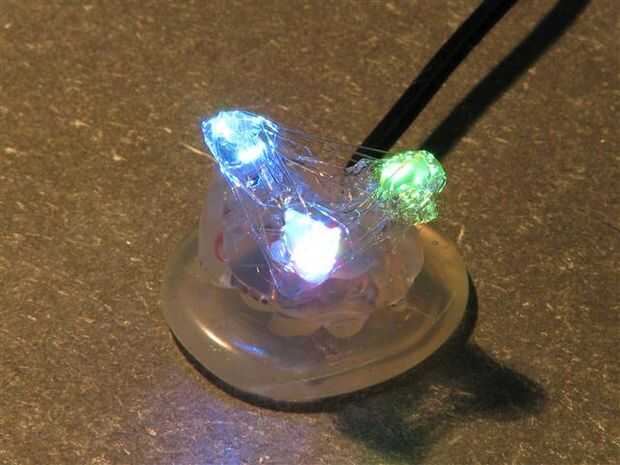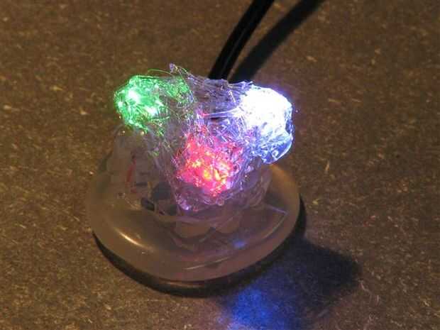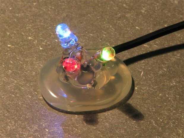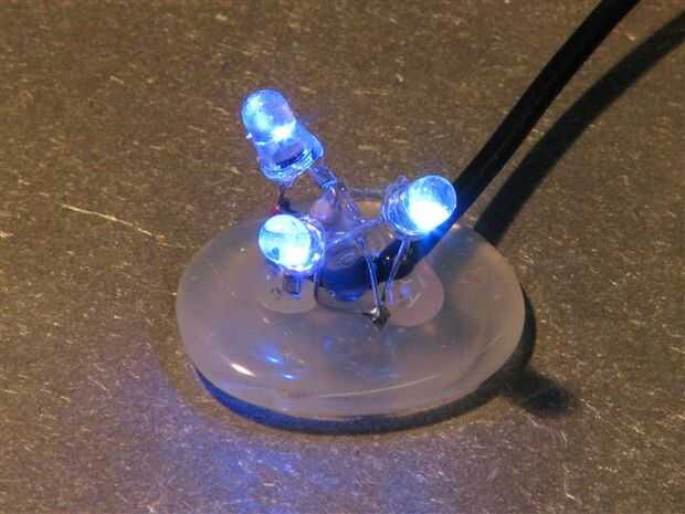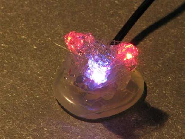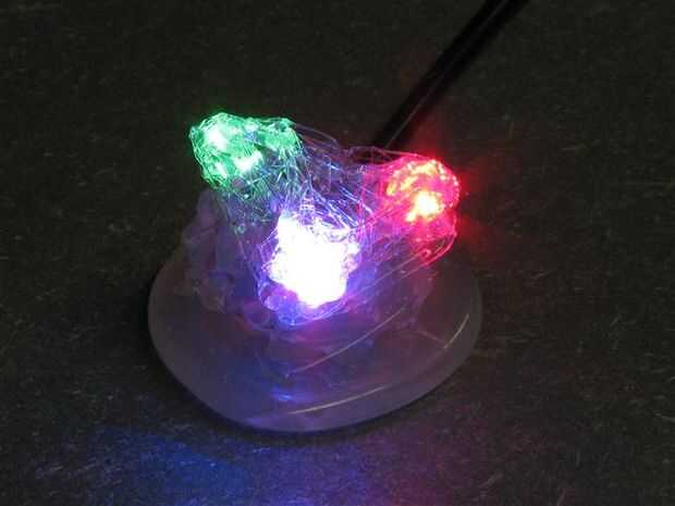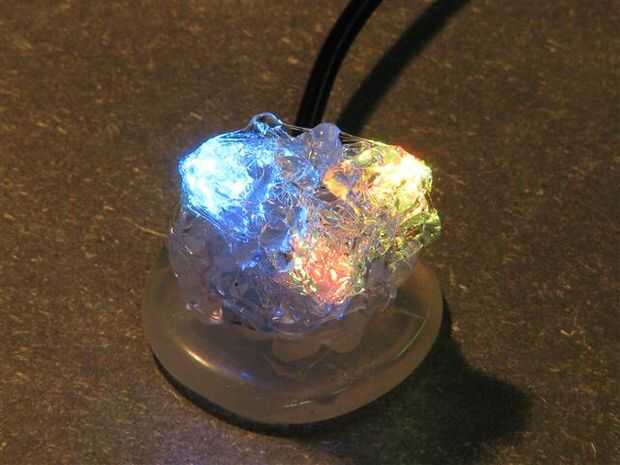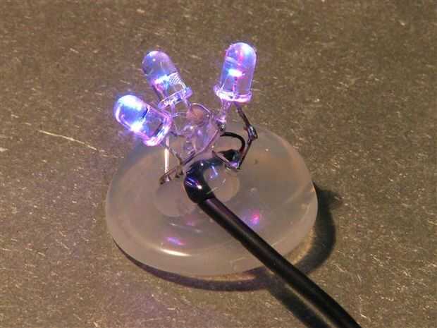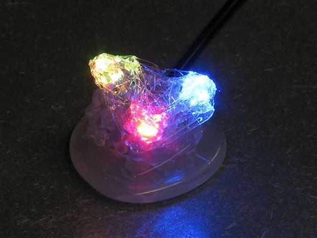 Enchufe el cable de nuevo en a la luz de los LEDs y drible, spot, dab o cadena el pegamento alrededor de los LEDS para construir a su alrededor. La cola permanece claro durante algún tiempo hasta que se enfría completamente toma tan frecuente se rompe para que pueda obtener una idea del efecto final. Las imágenes de abajo muestran las etapas en un pegote de resplandor 'fibrosa'. Mis otros son más globulares.