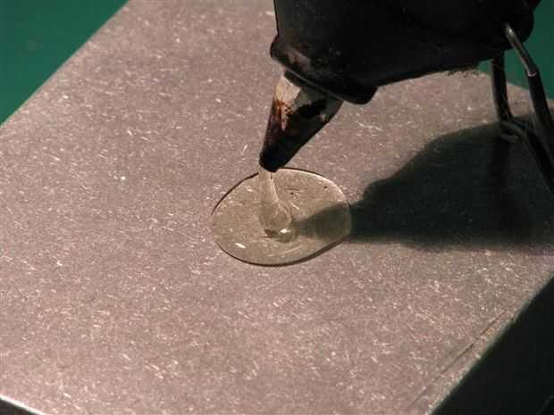 Poner una gota de aceite o grasa en un tejido y limpie el metal de la placa ligeramente aceite lo. Esto detendrá el pegamento se adhiera. Hacer un charco de pegamento caliente por lo que se extiende a alrededor de 1" a 1.5" (25mm - 37mm) de diámetro y se deja endurecer. Esta es la base.