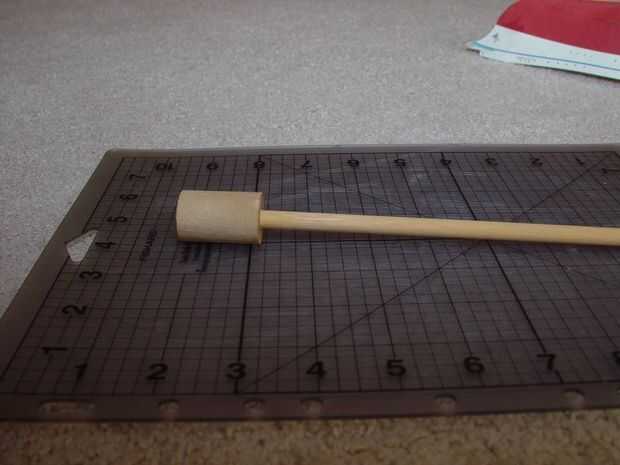 Nos fuimos un poco más de lujo. Cortar una longitud de 8" de 5/16 espiga y una 1.25" longitud de aproximadamente de 7/8" espiga. Perforar un agujero de 5/16" en una cara de la longitud de espiga de 7/8" y pegar la espiga 5/16" en él. (Como siempre, utilice gafas de seguridad).