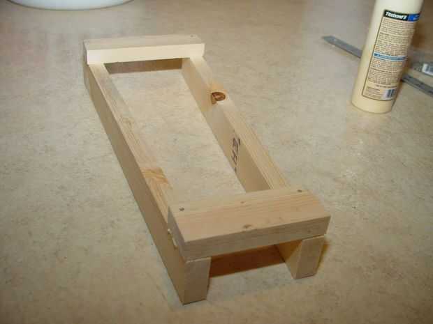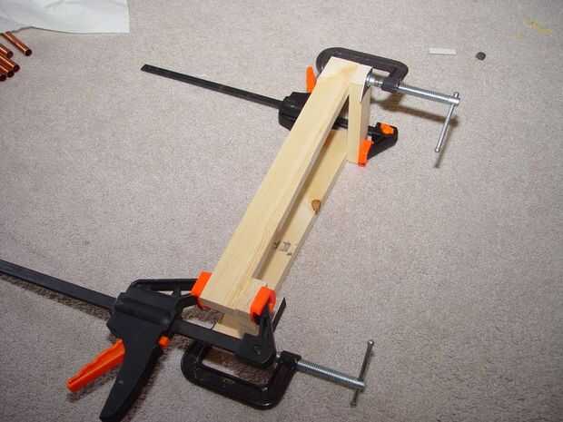 Invierta las piezas largas, con las marcas hacia abajo y espacio según las medidas. Ahora necesita unir los travesaños, manteniendo las piezas largo la distancia correcta aparte. Lo que hice fue usar una combinación de clavos y pegamento de madera, dos clavos por cruza. Taladré orificios para clavos (intentó sin y consiguió partir), poner pegamento en donde sería la jint y clavar la primera pieza de Cruz en el lugar. Entonces antes de la cola (no utilice un adhesivo de fraguado rápido como Super Glue!), ajusta el ángulo del marco de la simetría y el correcto espaciado en el otro extremo. Luego encolada y había clavada al otro lado.
