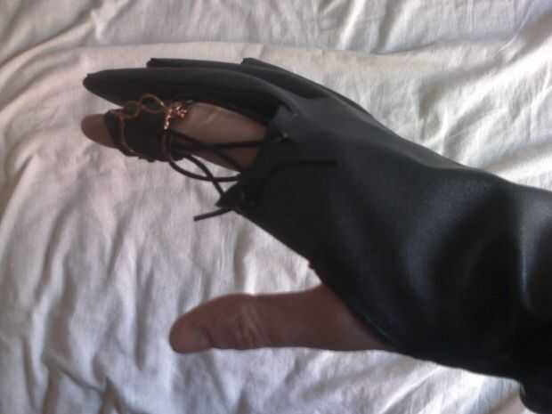 El pulgar fue cortado para permitir el mejor movimiento del pulgar. Cortaron los dedos, luego una porción del dedo entre el primer y segundo nudillo fue tomada, envuelto en alambre de cobre (para reforzar) y luego colocar utilizando cuerda de cuero.