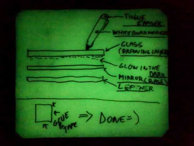 Don´t confuso, la idea es simple: pones material de brillo entre la Base y la capa de dibujo que en mi caso es de cristal. Y dibujar en él como en una pizarra regular con pizarra marcador (borrado en seco)