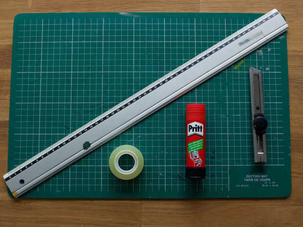 2) necesitarás un pegamento cortador cuchillo y una regla, cinta de papel.