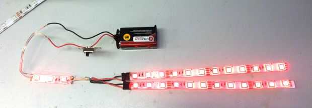 Una vez que tu tiras de LED son la longitud correcta, levantar el trozo de cable de altavoz y cortar secciones para conectar las tiras LED, la batería y el interruptor.
